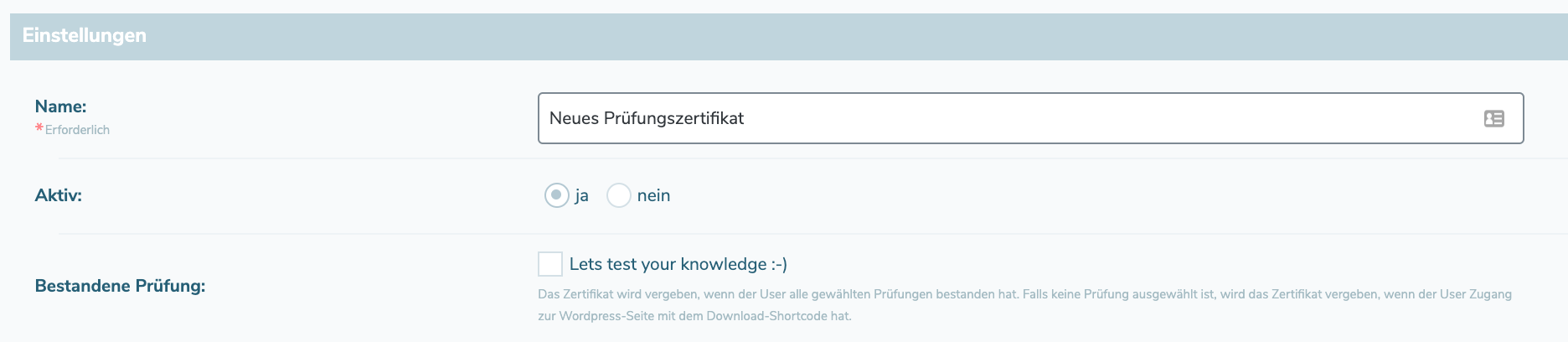 Under Settings, name the certificate and select the exam for which it should be issued (if successfully passed)