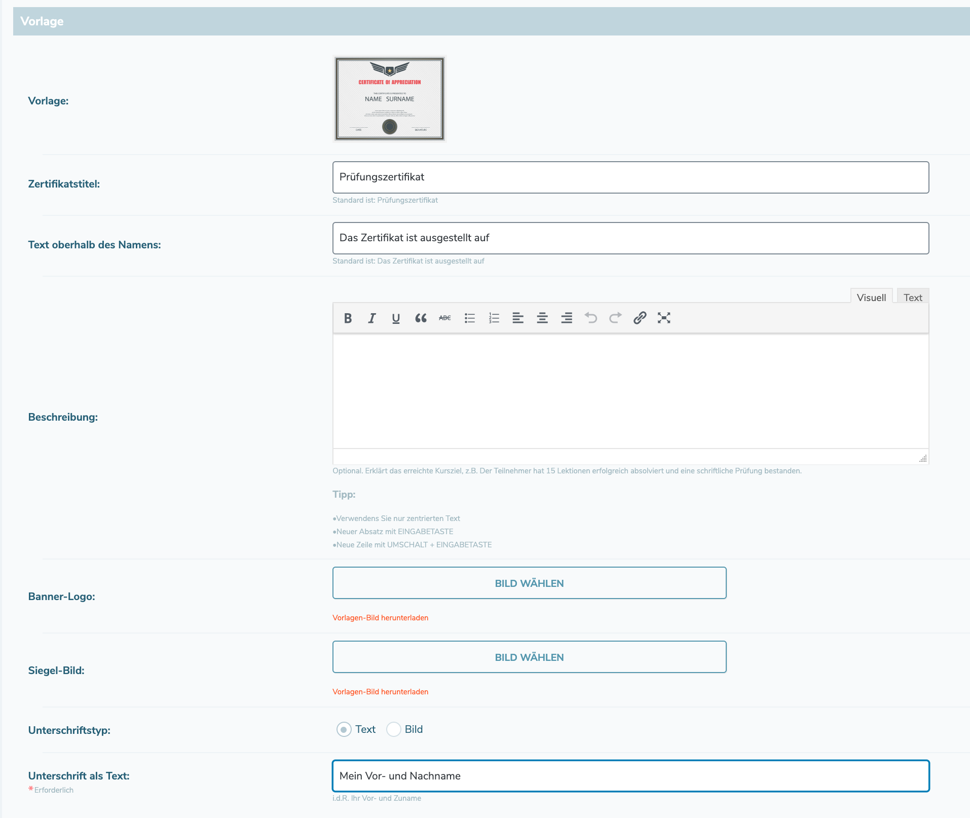 - Give the certificate a name and choose which exam you want to associate with this certificate. Then you can adapt your certificate and design it individually with text and upload a seal if you want to.