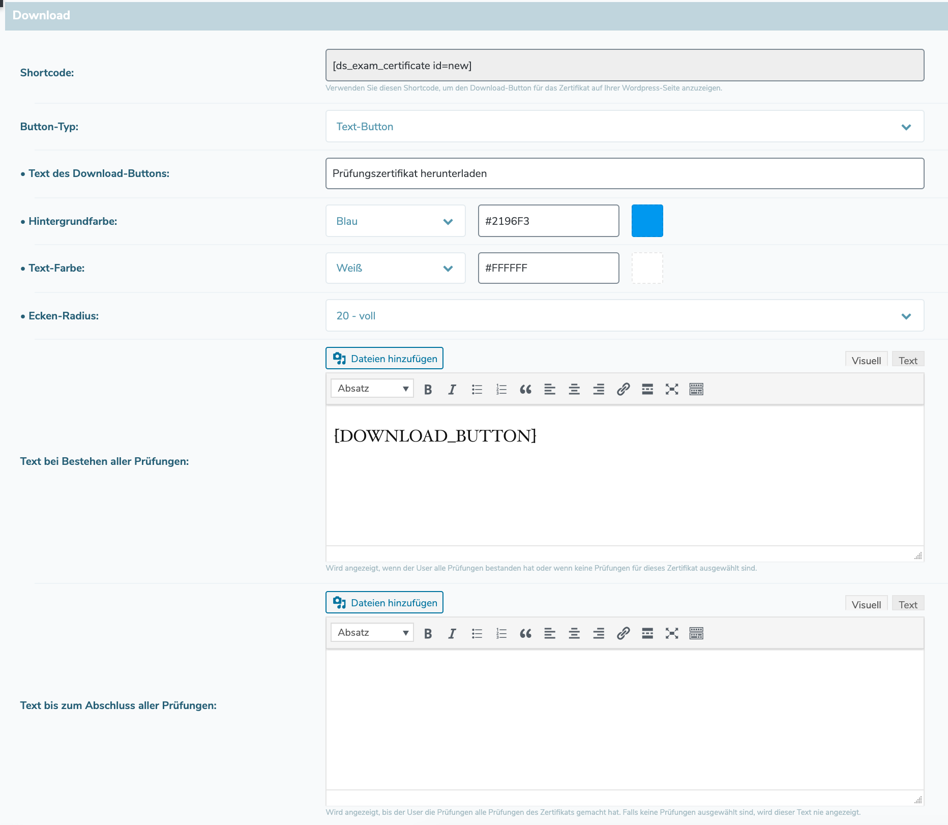 - Then you have to insert the shortcode for the "Download certificate" button on any page where the participant can download the certificate if he or she has passed the exam.