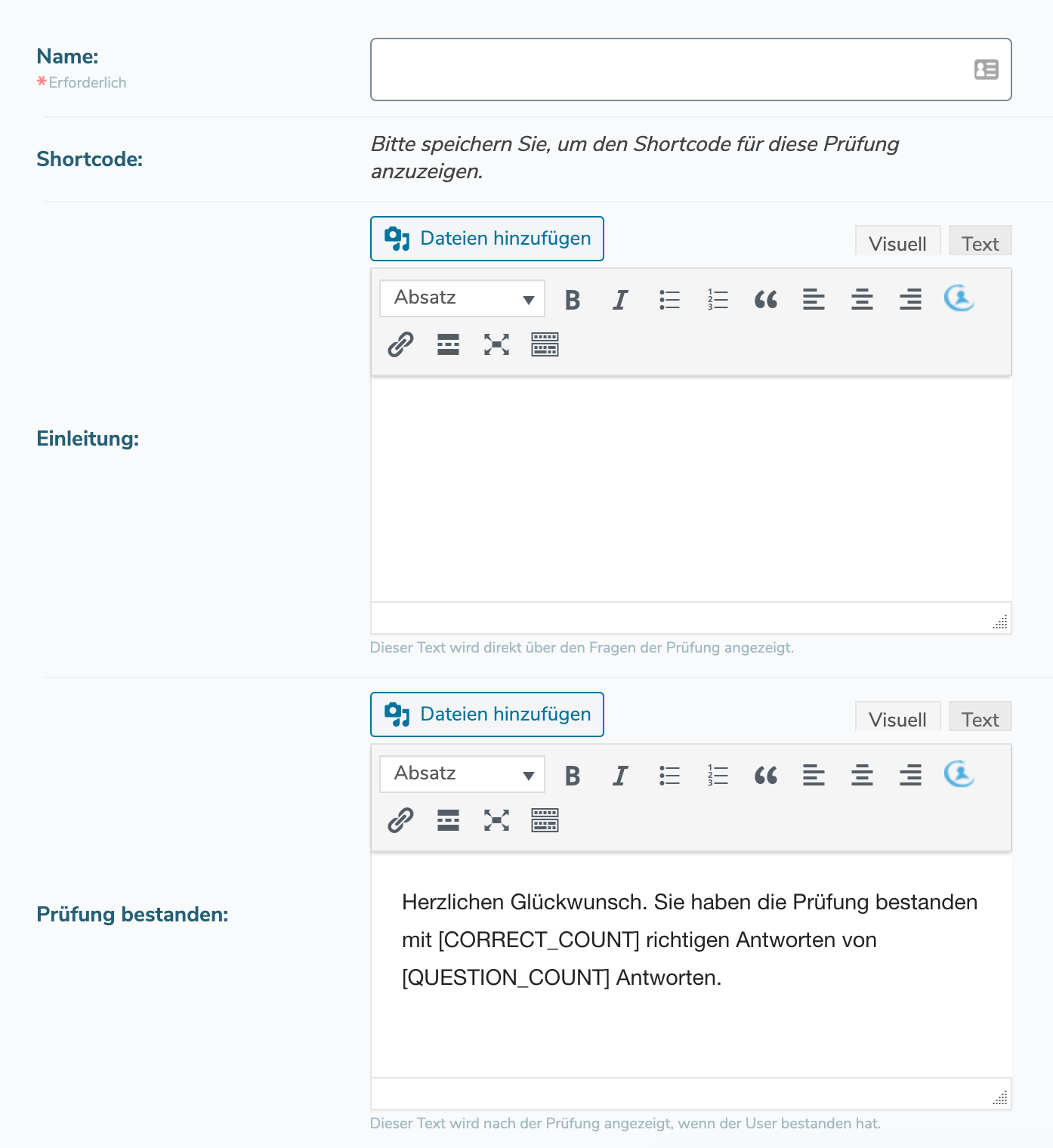 Under "Texts" you can specify further information and details about the exam. Among other things, you can write an introduction to the exam and go into details that are relevant for the user.