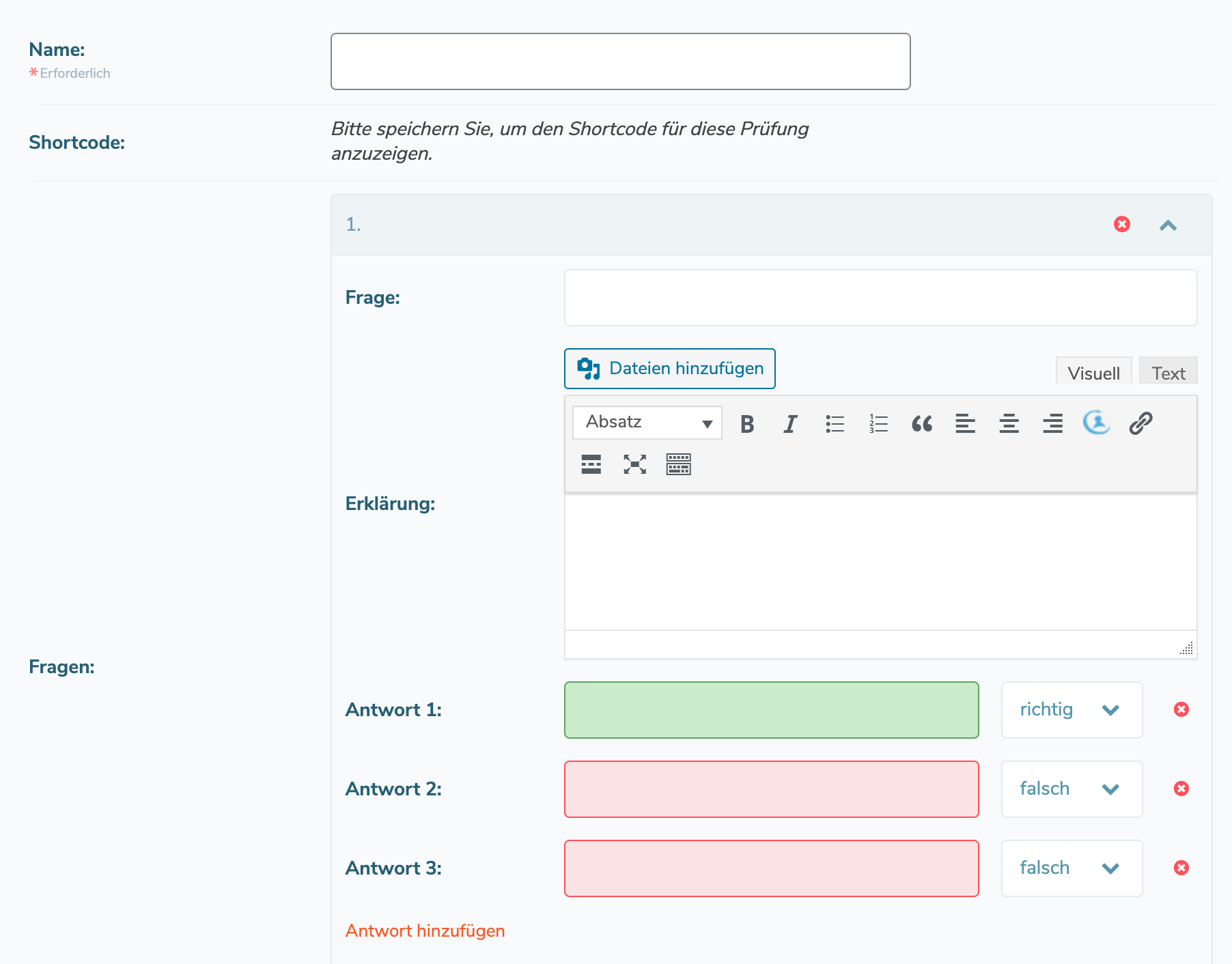 - Give your exam a name and create questions and their possible answers.