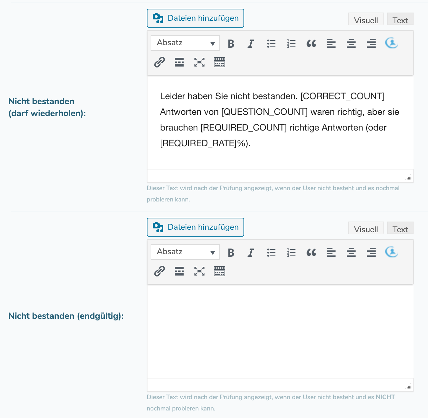 If the user has finally failed the exam (you define the number of attempts under "Exam property"), then you define a corresponding text message to the user under "Failed (final)". This text will be displayed after the check if the user does not pass and cannot try again.