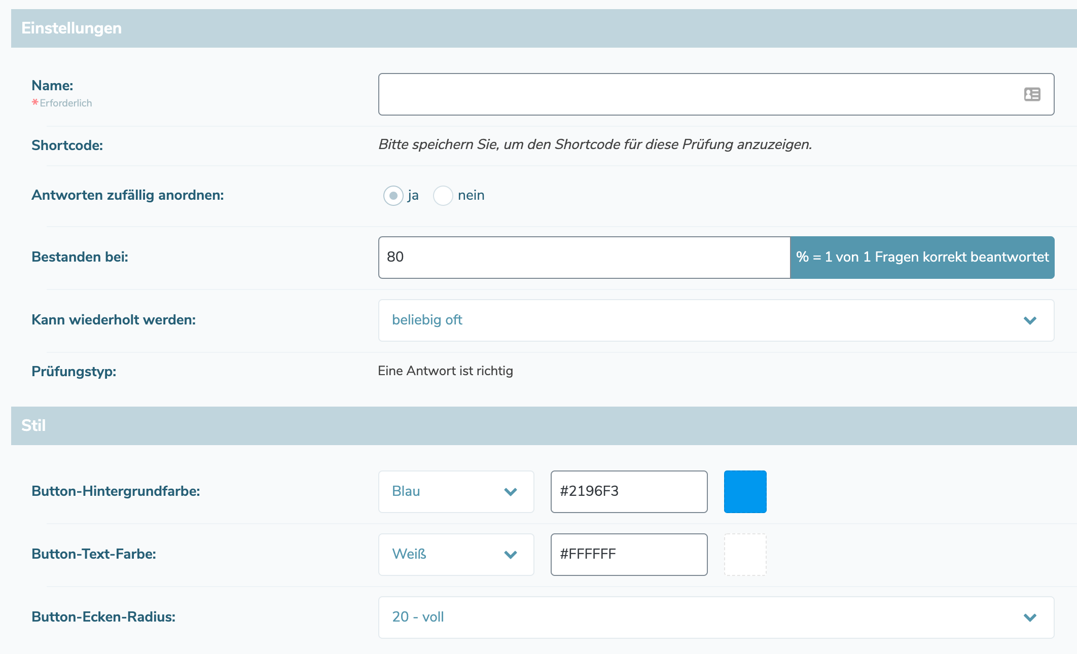 Here you define the properties of the check. Among other things, you define whether the answers to the exam should appear in a random order and how many questions must be answered at least correctly to pass the exam. You also define whether an exam can be repeated as often as required or whether only a limited number of attempts are available.