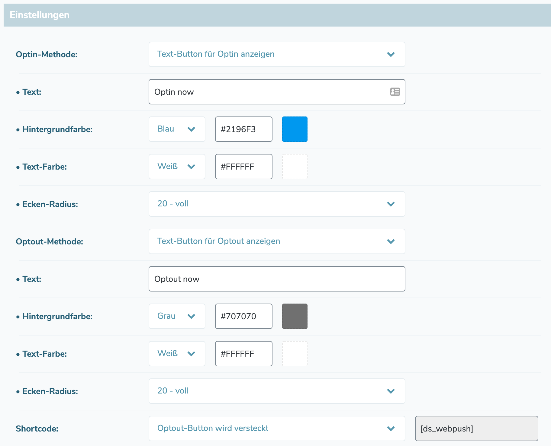 Then define the optout method and use the shortcode "Subscribe now" on a page/post where the user should be redirected to after clicking on the Web-Push message.