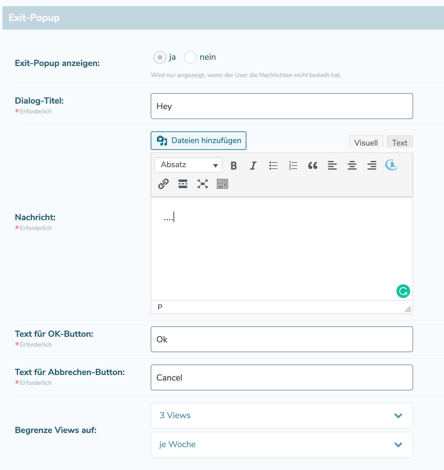 In the exit popup, you define the text message to the user and also the number of views in the period you have defined.